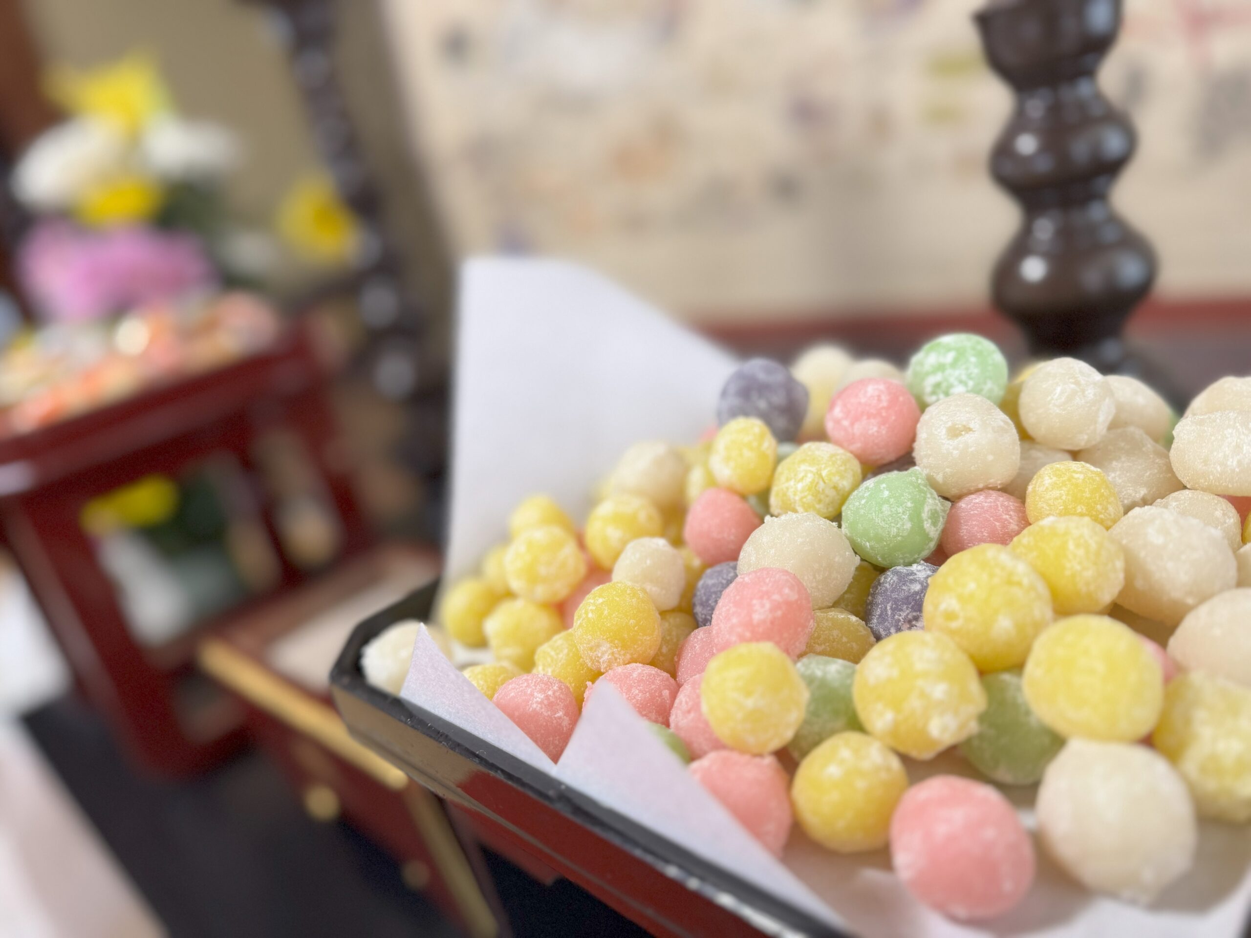 当日は、彩り豊かなお団子とお供えされたお菓子をたくさん用意しております。お子様から大人まで、皆さまで福を分け合いましょう。