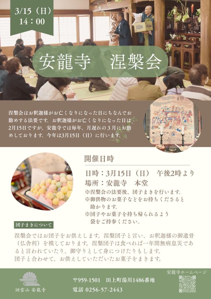 春の訪れとともに、当山・安龍寺ではお釈迦さまを偲ぶ「涅槃会(ねはんえ)」を執り行います。本来、お釈迦さまが入滅された(亡くなられた)のは2月15日ですが、当山では古くからの慣わしにより、一ヶ月遅れの3月に修行いたしております。 法要の後には、古くから親しまれている「団子まき」も行います。どなたでもご参加いただけますので、ぜひお気軽にお越しください。